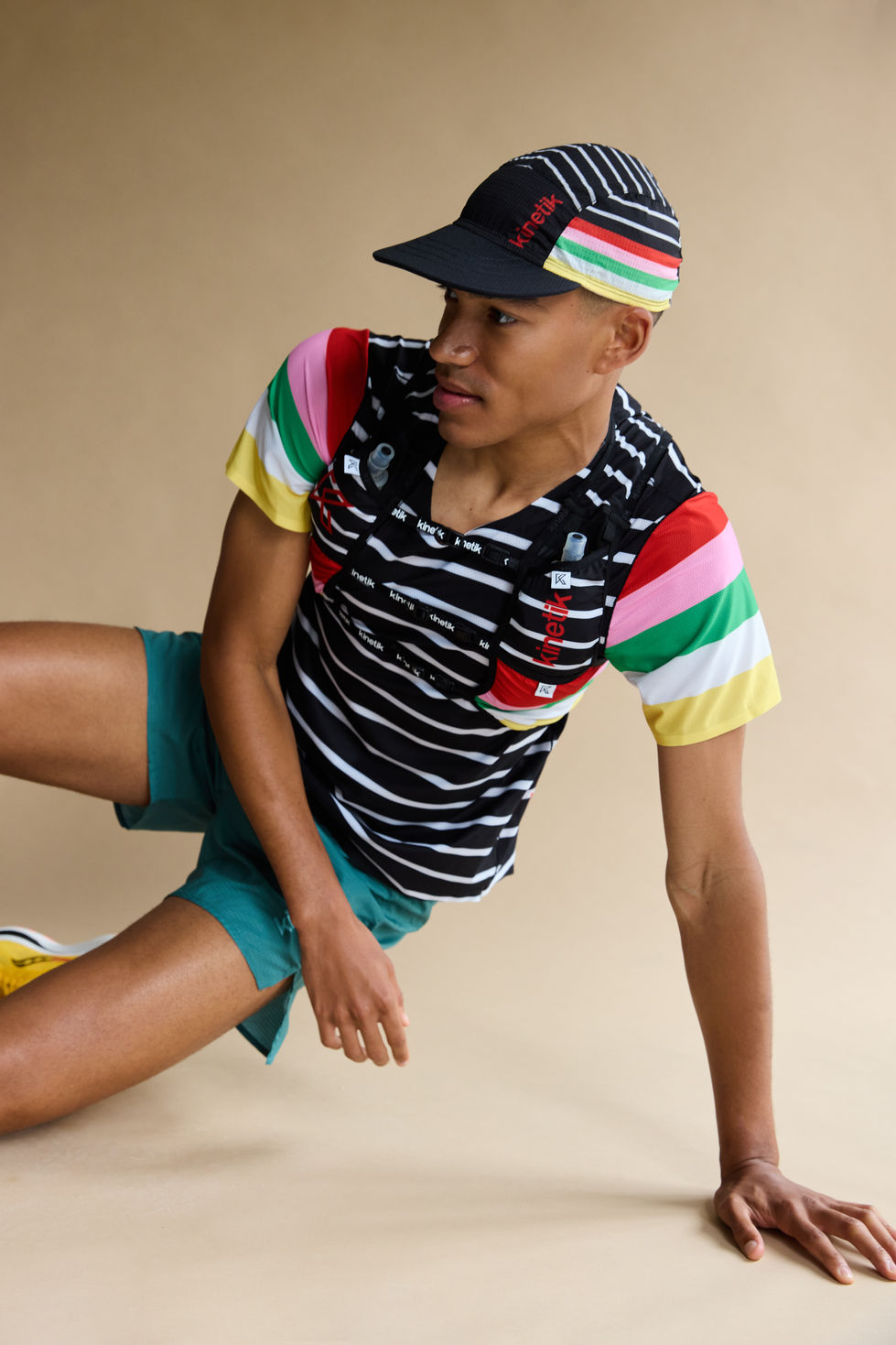 Pour cette série, Laurane Croguennec, styliste photo, insuffle une dynamique sportive et audacieuse à l’univers de Kinetik. En studio, Hugo, Léna et Amélie incarnent l’énergie pure du mouvement, sublimée par un équipement vibrant où couleurs intenses et motifs graphiques se conjuguent à la technicité du vêtement.
