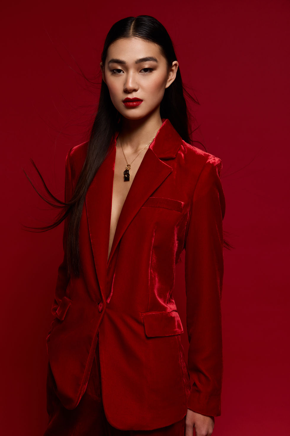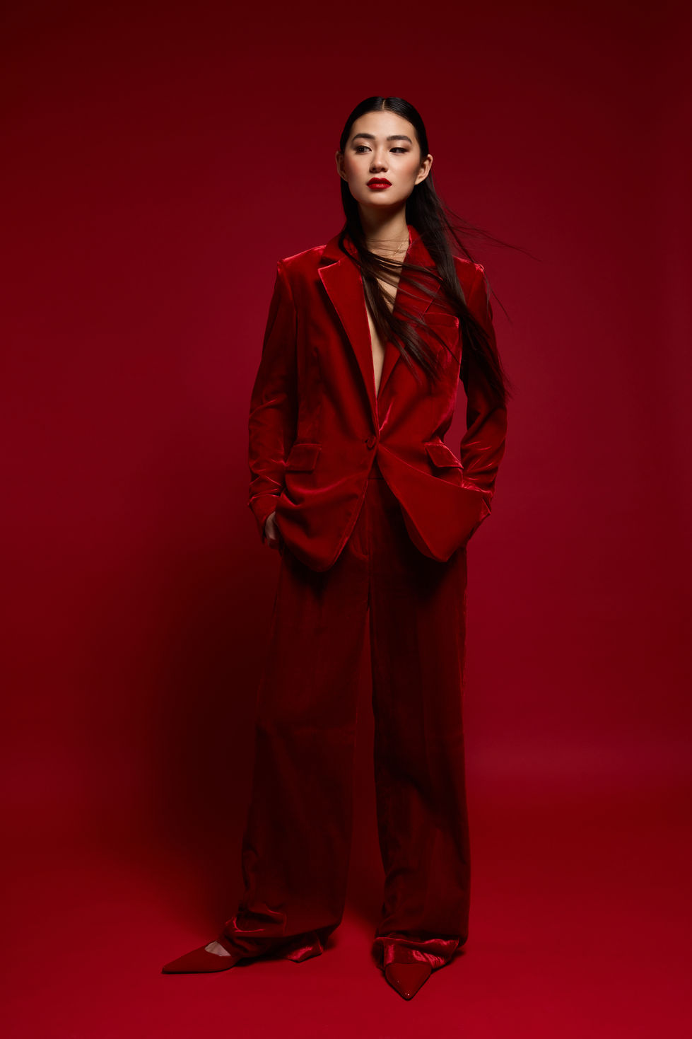 Le rouge s’impose comme le thème central de ce shooting studio. Couleur de caractère, il structure toute l’identité visuelle de la série : intense, affirmé, il habille les silhouettes et définit l’ambiance.